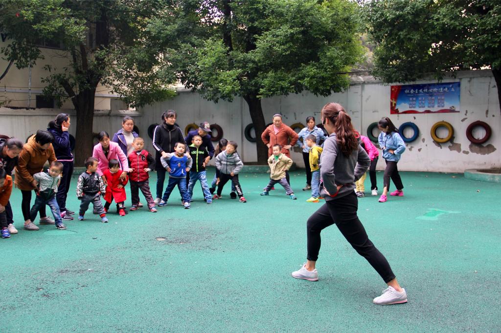 进入主课内容时,其他志愿者在其中辅助主教练,对孩子进行动作引导。