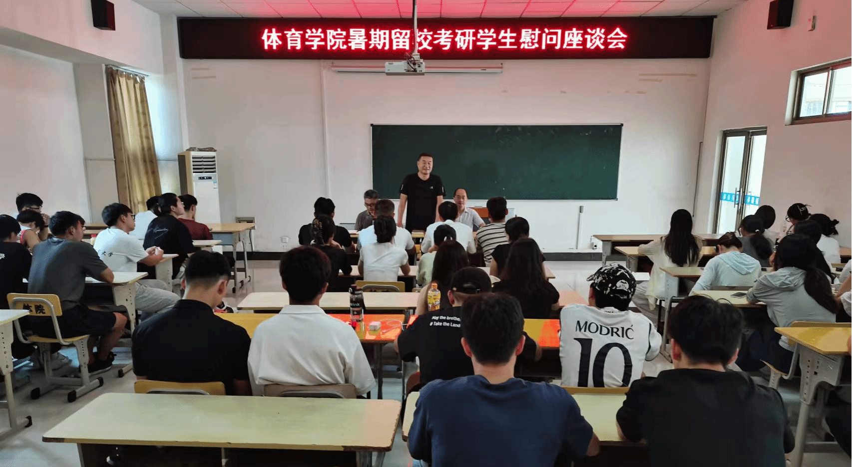 周多奇了解了同学们近期的学习、训练和生活情况,对同学们暑期留校备考学习的决心表示肯定和支持,并就同学们所关心的考研院校选择、考研科目复习规划等问题做了详细指导。他强调,同学们在学习过程中要注意劳逸结合,闲暇时刻走出宿舍、教室,和留校的同学伙伴一起进行体育锻炼,只有练就强健体魄,才能打好长久战,赢得最终胜利。