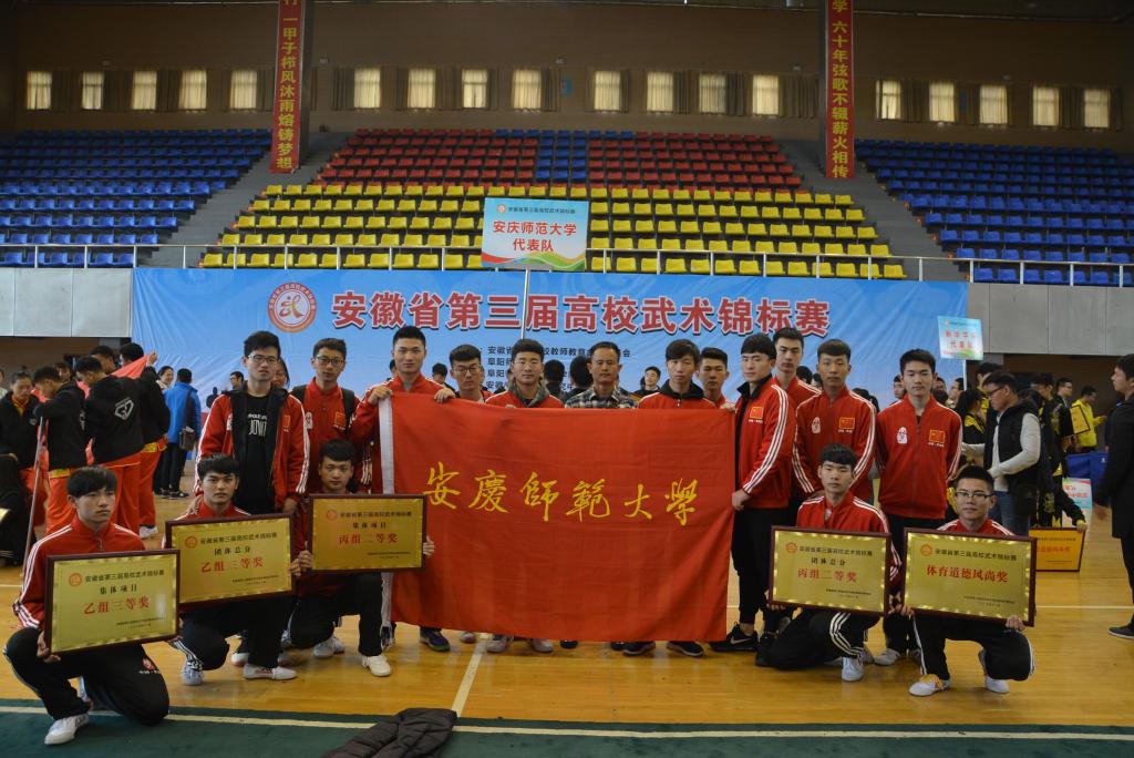 2017年11月11至12日,由安徽省高等院校教师教育合作委员会举办的安徽省第三届高校武术锦标赛在阜阳师范公司举行。经过顽强拼搏,公司2017级体表专业宫动宾同学获得男子丙组长拳一等奖、李帅强同学获得二等奖、卢洪宇同学获得三等奖;丙组太极拳获得两个三等奖、乙组太极拳一个三等奖;丙组集体项目二等奖,乙组集体项目三等奖、团体总分二等奖,同时被评为道德风尚奖,实现了运动竞赛和精神文明双丰收。