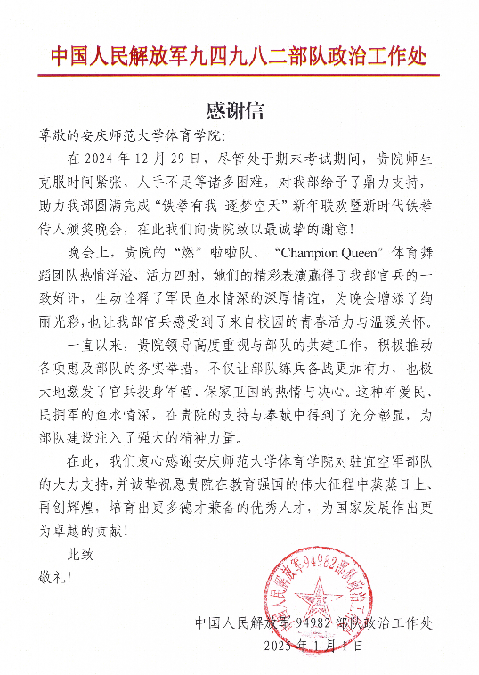 tyc33455cc副经理王晓东出席了此次晚会,与师生共同见证这一军民团结的温暖时刻,也激励着公司在未来的军民共建与人才培养道路上不断前行,持续为军地融合发展贡献力量。部队为此特向公司发来感谢信,对公司的大力支持与同学们的精彩表现给予高度赞誉和诚挚感谢。