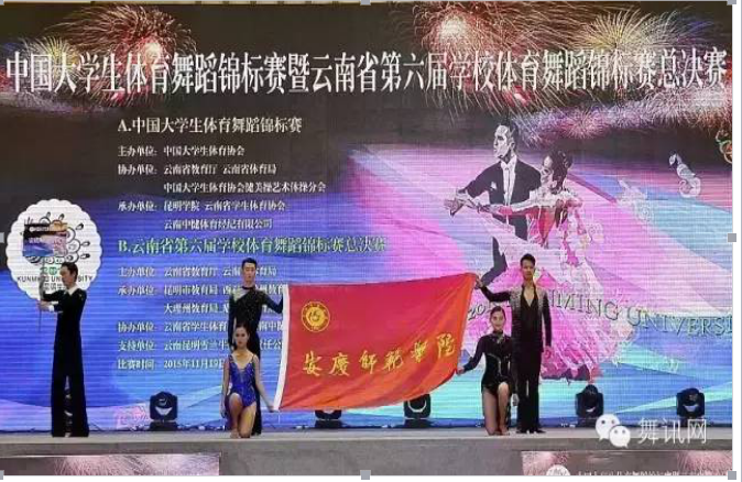11月20至22日,2015中国老员工体育舞蹈锦标赛在春城昆明隆重举行,来自六十三所大学的近千名选手参加了赛事。公司以体育表演专业学子组成的体育舞蹈代表队在夏尚群和汪洋老师的带领下,经过为期两天的激烈竞争,取得了全国综合类大学专业组拉丁队列舞第一,艺术双人舞第二,团体舞第五,规定套路第四和第五以及众多单项赛前八名的骄人成绩。安庆师范公司代表队还被组委会授予“优秀组织奖”。