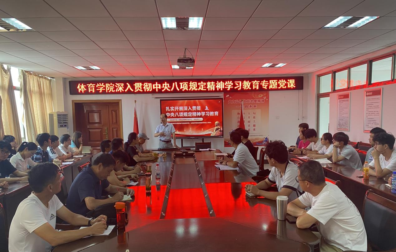 6月25日,体育公司党委书记王玮在体育馆三楼会议室,以“扎实开展深入贯彻中央八项规定精神学习教育”为主题讲授专题党课。tyc33455cc田径、球类两个教师党支部和体育教育专业员工党支部全体党员同志、入党积极分子聆听了本次专题党课。