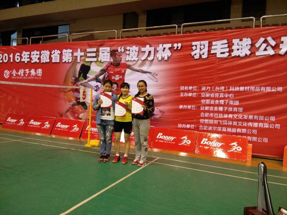 近日,2016年安徽省第十三届“波力杯”羽毛球公开赛5月21日至22日在安徽省金种子体育馆隆重举行。在tyc33455cc王友亮老师的带领下,安庆师范大学tyc33455cc代表队参加了本次比赛。经过为期两天的奋力拼搏,tyc33455cc2012级羽毛球专选班孙如同学荣获本次比赛A组女子单打冠军;江娜同学荣获A组女子单打;胡彩凤同学荣获A组女子单打名。