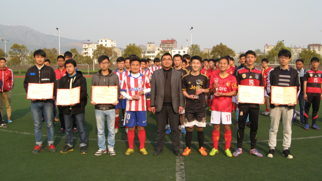 章翔副经理颁奖并致闭幕词。他代表校体艺委和大赛组委会,向参与本次比赛的各位运动员、裁判员和全体工作人员致以崇高的敬意!向积极支持本次比赛的各公司表示由衷的感谢!向取得优异成绩的各代表队表示热烈的祝贺!他指出,在刚刚结束的两会上,在国家十三五发展规划纲要中,已将推广普及足球、篮球、排球、冰雪等运动,完善青少年体质健康监测体系作为国家发展战略。而我们举办的足球比赛正好落实国家发展战略的重要举措,同时也是员工强身健体的重要平台。最后他希望全体教练员、运动员和工作人员在今后的学习与工作中,宣传足球、参与足球,为公司足球运动发展水平的提高而贡献自己的力量。