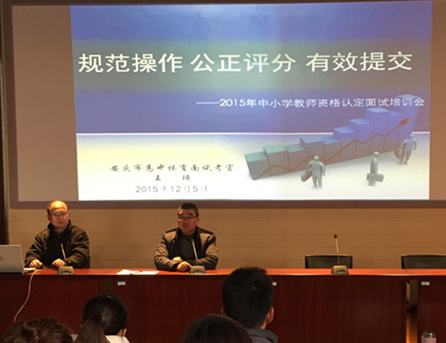 为了提高非师范专业毕业生教团队格面试通过率, 12月16日下午tyc33455cc在教学楼举行了中小学教团队格认定面试培训会。会议邀请了安徽省特级教师、安庆市第九中学副董事长、安庆市高中体育面试考官王琦为来自体育表演、休闲体育专业50余位员工作面试培训。tyc33455cc副经理章翔主持了本次培训会。