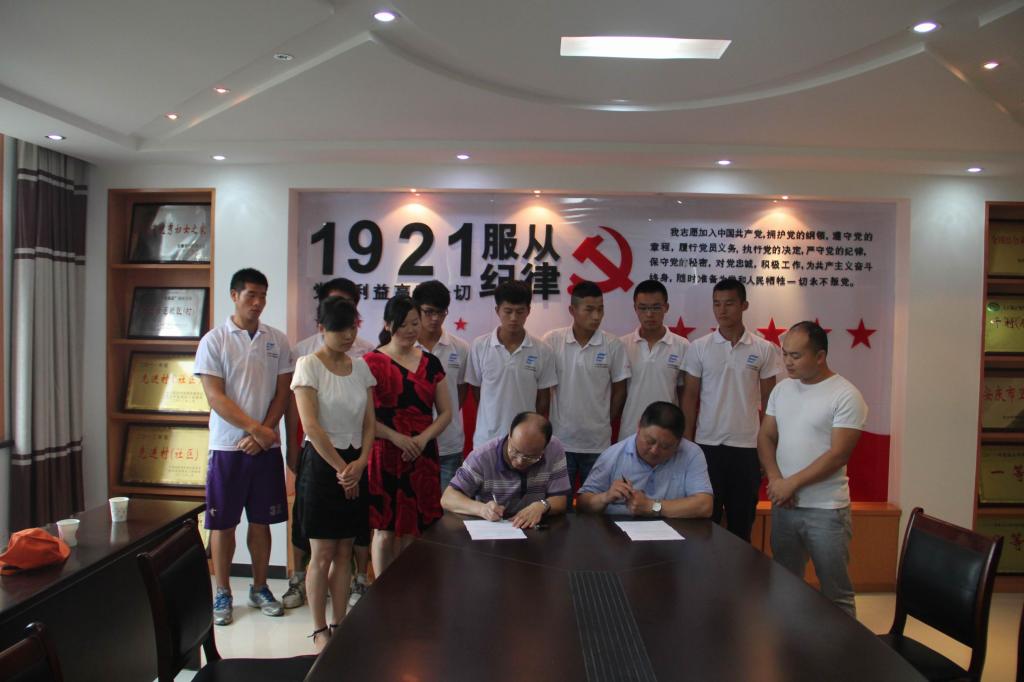为进一步贯彻落实党的教育方针,为广大青年员工投身社会实践活动搭建一个良好的平台,7月4日上午,tyc33455cc和宜秀区大龙山镇燎原社居委共同签订了老员工社区体育指导社会实践活动基地协议书,并举行了实践基地揭牌仪式。公司党总支副书记韦长发,院员工工作办公室主任鲁雷,团总支副书记、员工工作办公室副主任汪洋等老师和赴燎原社区参加暑期“三下乡”社会实践活动的员工共计20余人参加了实践基地挂牌仪式。