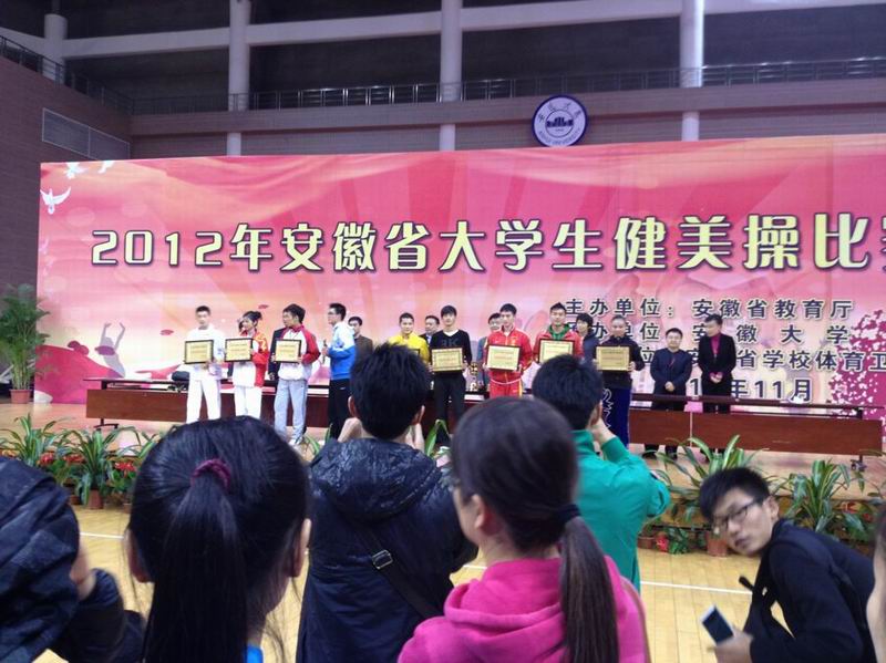 11月3日到5日,由安徽省教育厅主办、安徽大学承办、安徽省公司体育卫生协会协办的安徽省2012年老员工健美操锦标赛在安徽大学馨苑校区体育馆隆重举行。由公司2010级体育教育专业9名员工组成的安庆师范公司健美操代表队在指导教师王云辉的带领下,继10月份在青岛举行的全国万人全民健身操大赛总决赛中取得佳绩后,再次在本次老员工健美操锦标赛中取得了优异成绩。在男子单人决赛中,杨阳同学力挫众多强手,获得了男单冠军;在男子三人操决赛中,杨阳、林伟伟等同学获得了季军;在男子六人操决赛中,吴鹏程、陈建建等同学获得了第四名;在混双决赛中,赵浩杰、徐静同学获得了第五名;在女子单人决赛中,张楠同学获得了第六名。另外,安庆师范公司代表队还获得了“体育道德风尚奖”;丁立和方锡球两位同学还被评为“精神文明运动员”。