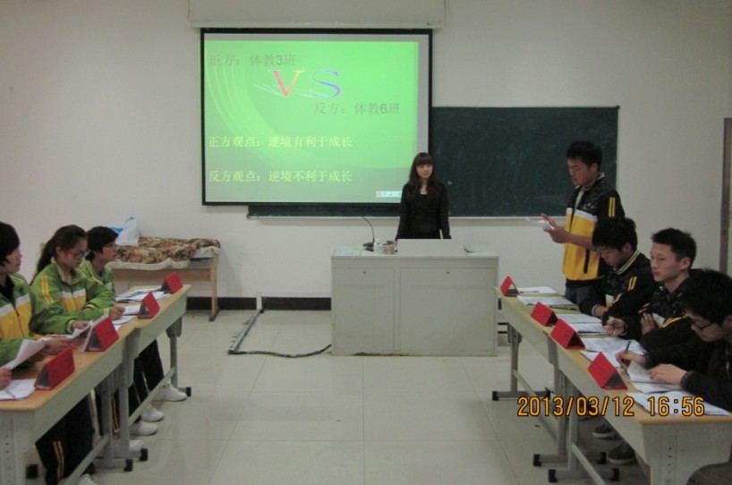 经过四轮比赛,体育教育专业2012级6班和体育教育专业2012级3班从10余支代表队中脱颖而出,进入了决赛。本轮决赛双方就“逆境有利于成长”这一辩题展开激烈的辩论。开篇立论阶段,双方一辩都用最精炼的语言阐述了己方的观点;攻辩阶段,正反方二、三辩选择对方二辩、三辩进行一对一攻辩,双方你来我往,各抒己见,气氛热烈,攻辩小结中,正反方均犀利地指出了对方的言辞中出现的问题,也更加确立了本方的观点;接下来的自由辩论环节,辩手们反应机敏、语言流畅、说理透彻;在观众提问环节,面对观众提出的问题,辩手们笃定沉稳地积极作答,赢得了现场观众的阵阵掌声;总结陈词环节,双方四辩再次强调各自所持观点,旁征博引、条理清晰。两支队伍在比赛中都气势逼人,力求在气势上压倒对方。双方面对对方辩友的猛烈攻击镇定自若,凭借快速的反应和有力的反驳化险为夷。