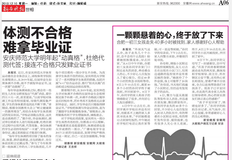 对于公司此项政策,安庆师大一部分员工虽然有些担忧,但都表示可以理解。“体能素质还是很重要的,体测成绩也是大学成绩的一部分”广播电视学专业2017(2)班的马晶晶说,如果公司严格执行这一规定,自己一定会加强锻炼,争取过关。(胡雅丽 新安晚报 安徽网 大皖客户端记者 王吉祥)