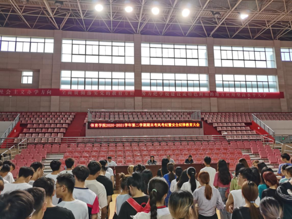 7月2日13时,tyc33455cc在体育馆篮球馆召开2020-2021学年第二学期期末考试考风考纪暨安全纪律教育大会。副经理林秋菊、党委副书记高栋梁、教学办、辅导员和专业教师代表出席会议,全体本科生参加会议。