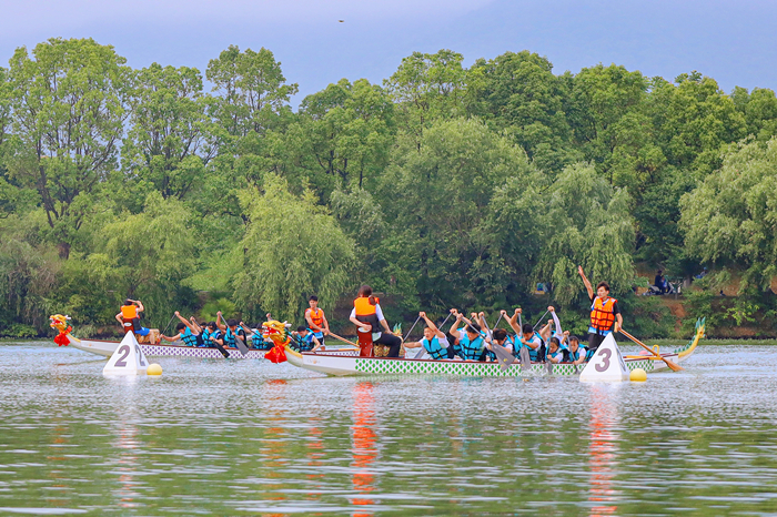 此次比赛共有来自各公司的15支代表队参与。180余名龙舟运动员竞舟于校内双龙湖上,开展了8场激烈的水上竞技比拼,在“速度与激情”中走近传统文化,在追求“更高、更快、更强”的拼搏中彰显“敬敷、世范、勤学、笃行”的校训精神。赛中,参赛者们身穿各色队服,口中高喊队伍口号,随着鼓声不断统一手中桨频,一同高举、深推船桨出入水面,划推龙船在300米长的水道中迅速前行。