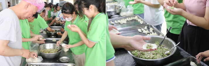 擀皮、切菜、和馅……团队成员们精心采购回到敬老院后,员工们与老人展开了一场“包饺子大赛”。“奶奶,您喜欢吃什么馅的饺子呀?”“爷爷,您看我的饺子包的怎么样?”在包饺子的过程中,老人们也不断向成员们介绍包饺子的“小诀窍”,“手把手”地指导每位成员包饺子的手法和技巧,在包饺子、话家常中拉近了彼此之间的距离。
