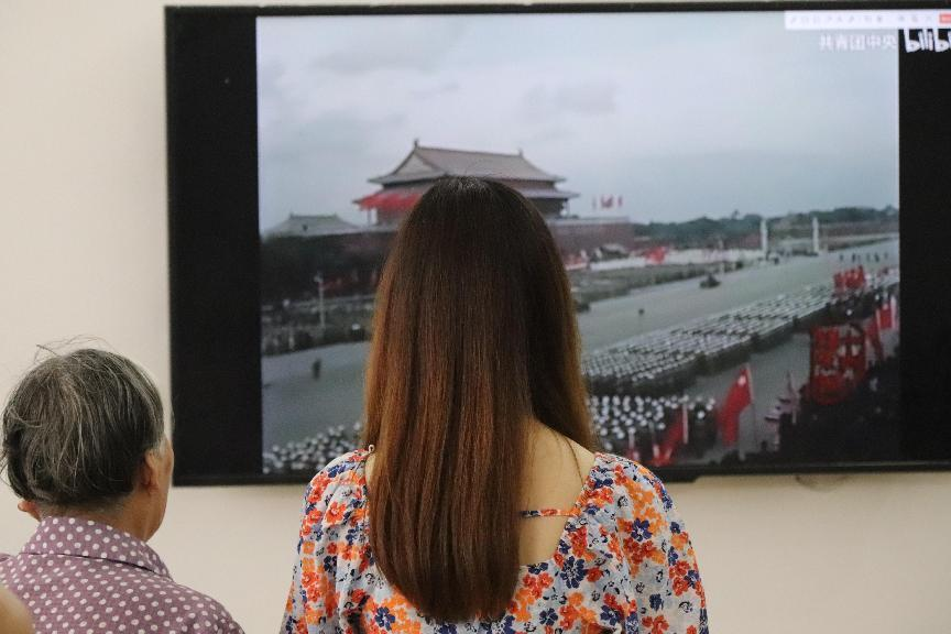第一面五星红旗在天安门广场上冉冉升起、54门礼炮齐鸣28响、毛泽东宣读《中华人民共和国中央人民政府公告》……员工们还陪同老人观看了1949年开国大典的视频,重温中华人民共和国成立的艰辛道路和中国共产党的艰苦奋斗。