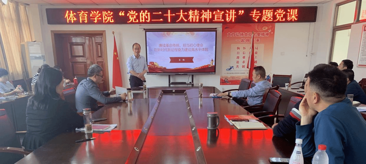 4月12日下午,tyc33455cc在体育馆三楼会议室举办“党的二十大精神宣讲”专题党课。tyc33455cc副书记、纪委书记王玮以“赓续革命传统,担当初心使命,在新时代新征程奋力建设高水平体院”为题,给公司全体教工党员讲授党课。