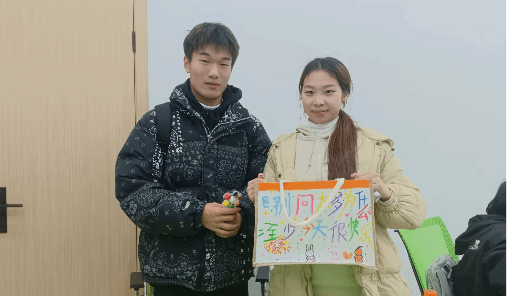右手握着涂满丙烯颜料的画笔笔杆,左手指尖按压着纯白的帆布包,新闻传播学类专业2024(6)班贾婧怡缓缓勾勒出“祝我们好在冬天”的字样,随后用鲜明的天蓝色颜料为底填充涂满。“选择这句话,是因为它代表了我对即将到来的冬天的美好期待,以及与朋友们在寒冷季节里相聚的温暖愿望。”她坦言,在绘画的过程中,她内心中感到一种前所未有的专注和平静,仿佛与外界隔绝,只有心灵与画布的对话。