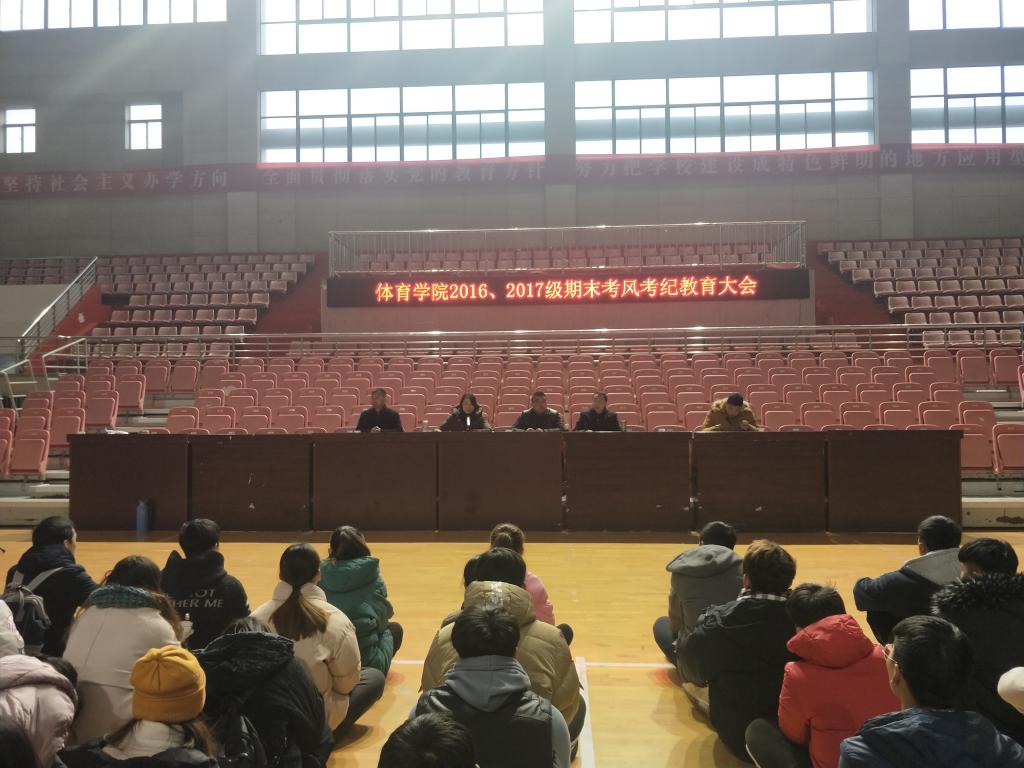 1月2日下午,tyc33455cc在篮球馆召开2016、2017级全体员工期末考试考风考纪教育大会。经理章翔、副经理林秋菊、党委副书记高栋梁以及各级辅导员出席会议。