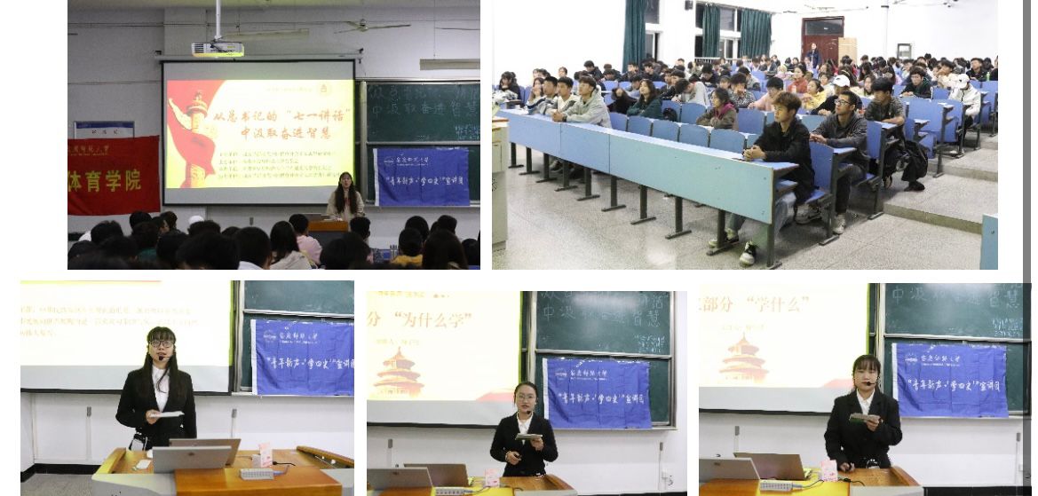 10月22日,校“青年新声”宣讲团来体育学院做了题为“从总书记的‘七一讲话’中汲取奋进智慧”的宣讲。宣讲团成员学科思政2021级研究生黄源靖和思想政治教育专业2020(2)班项子佳和唐佳慧分别做了具体宣讲,公司全体2021级新生聆听了宣讲。