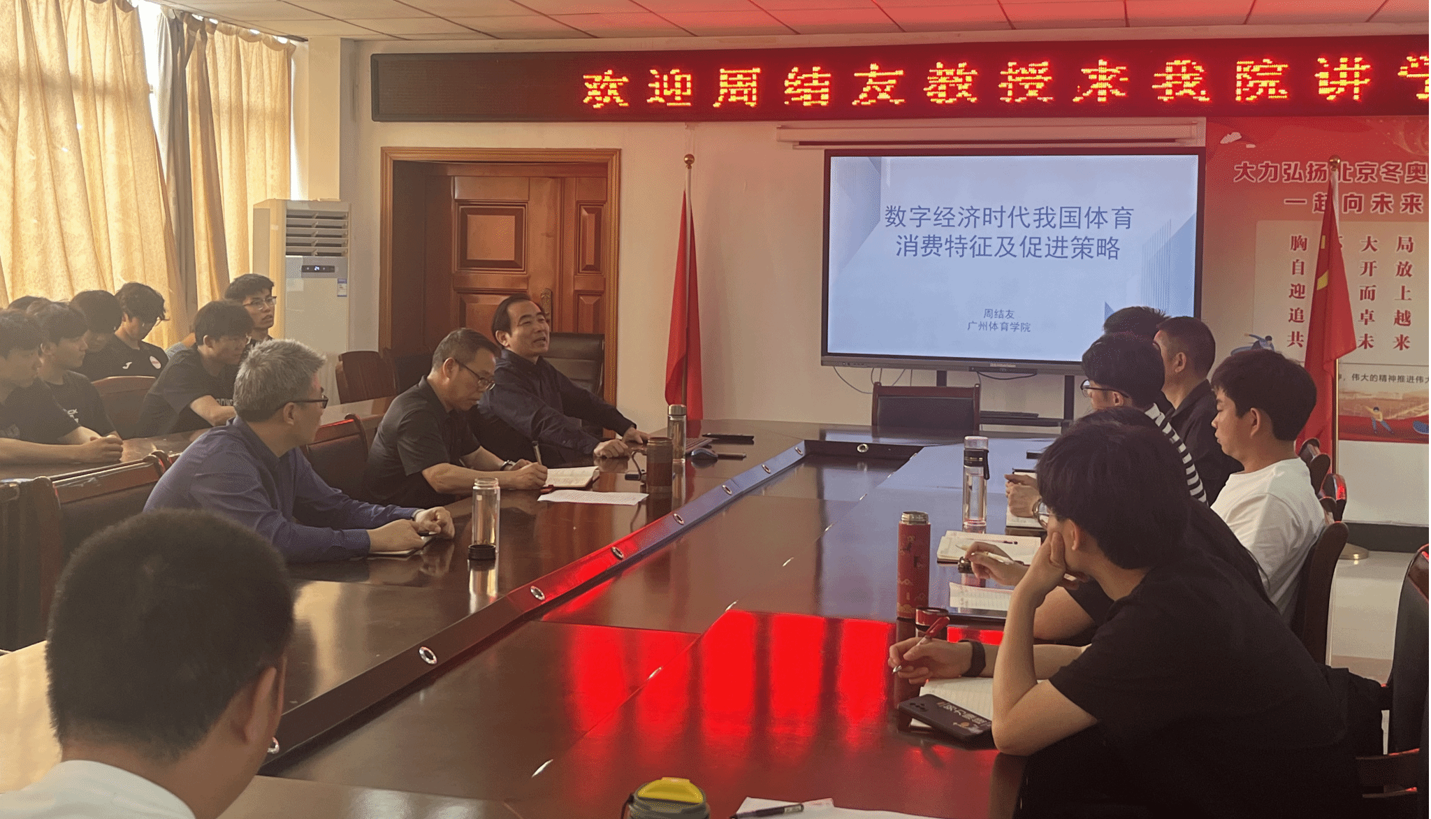 4月30日,tyc33455cc特邀广州tyc33455cc周结友教授,开展了《数字经济时代我国体育消费特征及促进策略》学术讲座。讲座由副经理孙明运教授主持,副经理王晓东、教师代表及研究生代表到场聆听。