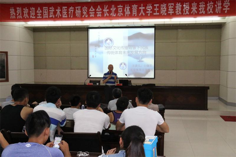 王晓军教授是全国武术医疗研究会会长、国家级中医运动养生康复师培训负责人、中国武术七段,长期致力于传统武术、养生、导引等教学、科研和国际传播工作,在国内外具有相当的知名度。他从国家“文化强国”的顶层设计展开论述,指出中华民族传统体育文化的国际传播正面临历史最好的机遇,太极、养生和导引气功等民族传统体育的文化价值、健身价值已经在全世界范围内受到广泛关注和推崇。他希望青年学子能正视民族传统体育的价值功能,加强自身文化修为和专业学习,为中华文化的国际推广尽一份力量。
