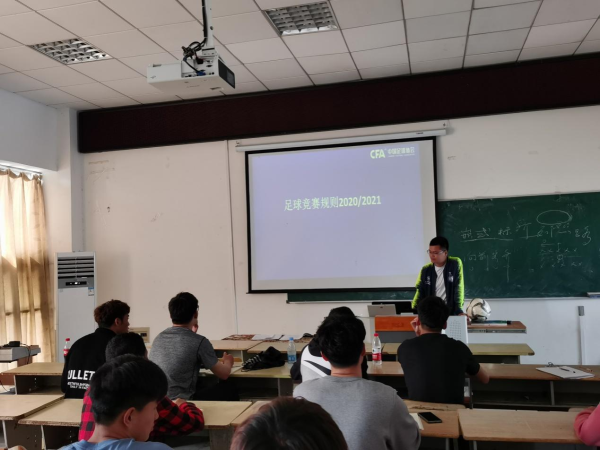 2021年4月23日下午14:30,公司乔伟老师在体育馆多媒体教室为老员工足球俱乐部成员、校足球队队员作主题为“2020-2021足球竞赛规则”学术讲座。