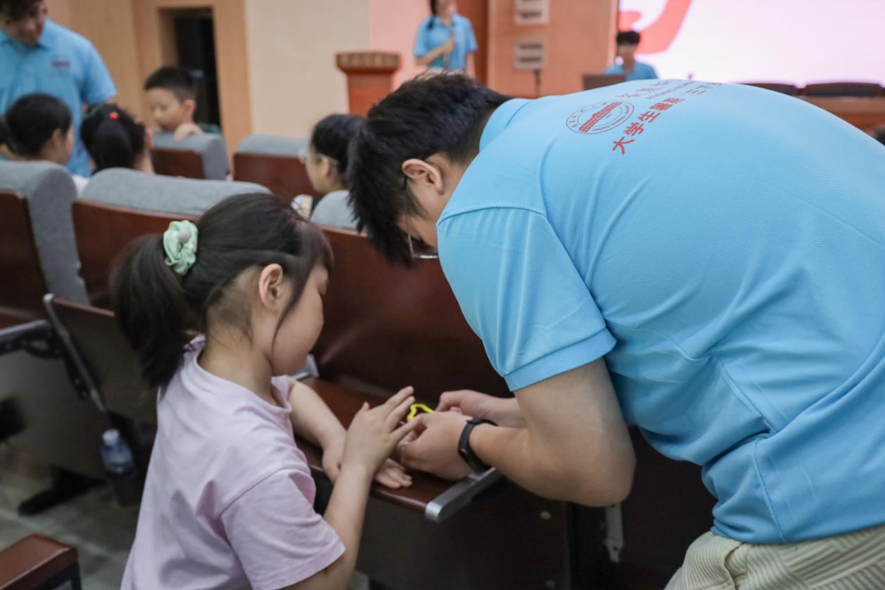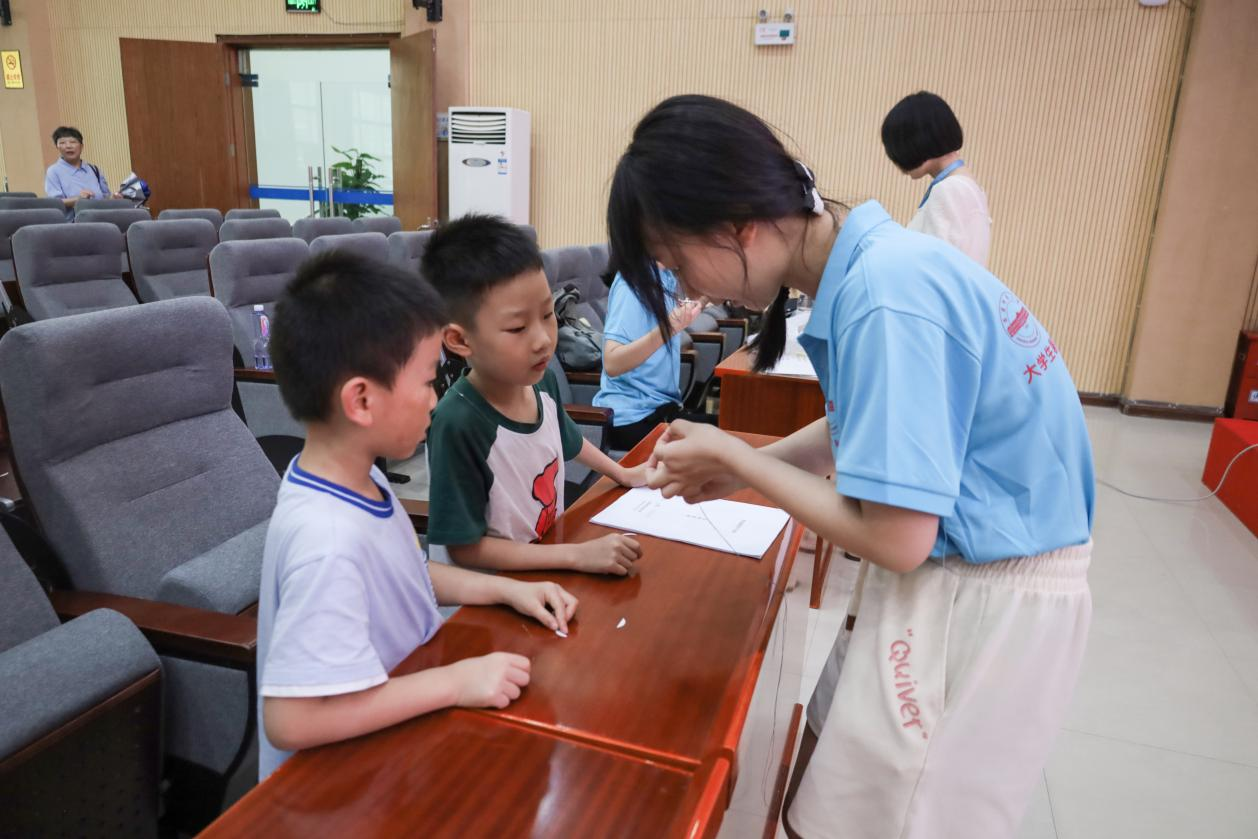 得知小朋友们之前并未了解过缠花作品后,团队负责人、体育教育专业2022(3)班的胡志豪特意带领团队成员们在进行缠花知识讲解前向小朋友们近距离展示了缠花作品。谈及活动开展的初衷,胡志豪笑着说:“因为我之前在公司的缠花俱乐部学习过,加深对缠花艺术的了解后,我认为我们有责任去弘扬缠花艺术。”他形象地描述教育就是一朵云推动另一朵云,“我们很高兴成为孩子们的一朵云。”