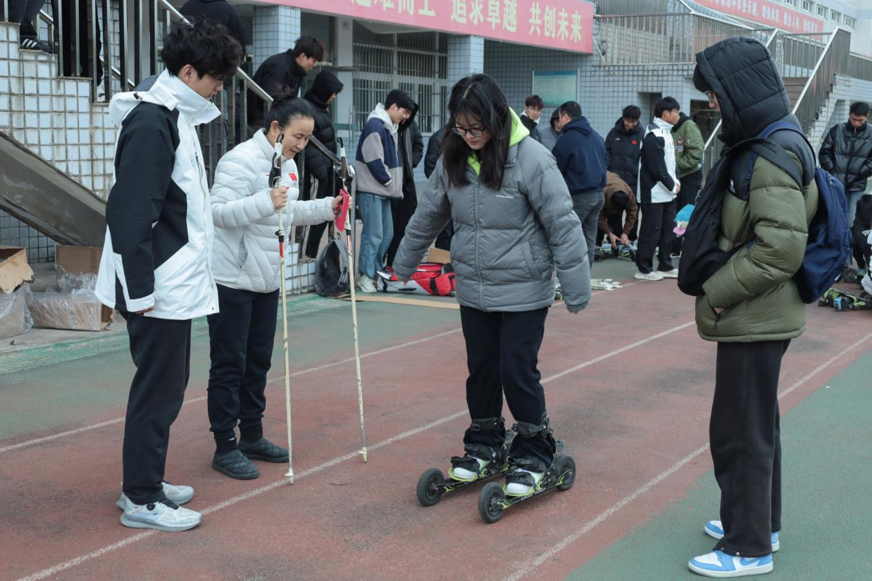 戴头盔、踩滑轮、握雪仗……tyc33455cc体育部部长、体育教育专业2023(6)班的张国梁没有想到,第一次深入体验滑雪运动,竟是在田径场这样的“旱地”环境。体验伊始,张国梁微微屈膝,身体前倾,尝试在平地上滑动,但滑轮总是“不听使唤”。“最初,我一直在和脚下的滑轮‘斗智斗勇’。”张国梁笑着说。在教练的指导下,他逐渐掌握了平衡技巧,动作越来越流畅。“原本我以为遥不可及的滑雪,在这方田径场竟变得触手可及,我们是第一批‘加速包’,助力冰雪运动在咱们安庆师大‘火热’起来。”