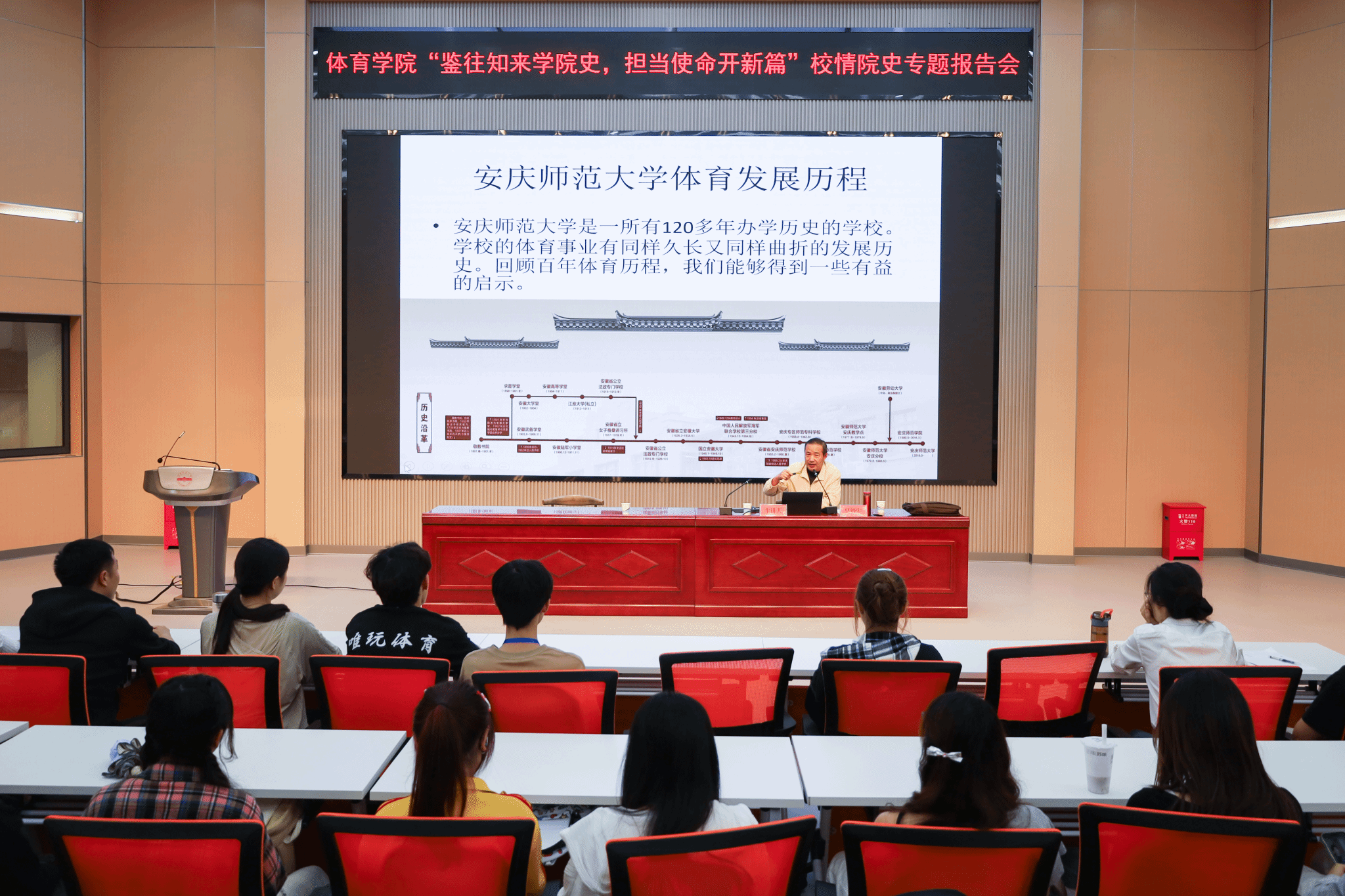 从体育公司初创时的简陋操场到现代化训练场馆,从寥寥数位教师到跨学科专业教师团队,讲座以时间为轴串联起体育公司发展脉络。tyc33455cc原党委书记吴毅安采用“场景式讲述”,通过展示不同时期的训练照片、赛事奖杯与团队建设成果,生动还原公司在教学改革、人才培养、社会服务等方面的突破。“希望大家把校情院史里的拼搏劲儿融进日常训练,带着老一辈‘敢啃硬骨头’的精气神,在赛场当尖兵、在课堂做先锋,让体育人的热血既能点燃领奖台,也能照亮未来的育人路。”吴毅安说。