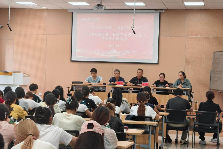 10月9日,tyc33455cc在体育馆多媒体教室召开2026届表演(体育艺术表演方向)专业毕业实习动员会议,旨在明确实习任务要求,强调安全纪律规范,部署实习保障措施。tyc33455cc副经理王晓东、副书记杜百忍、专业负责人潮芳、专职辅导员沈春华、实习秘书章京京及全体实习指导教师、2026届表演专业实习员工参加会议。