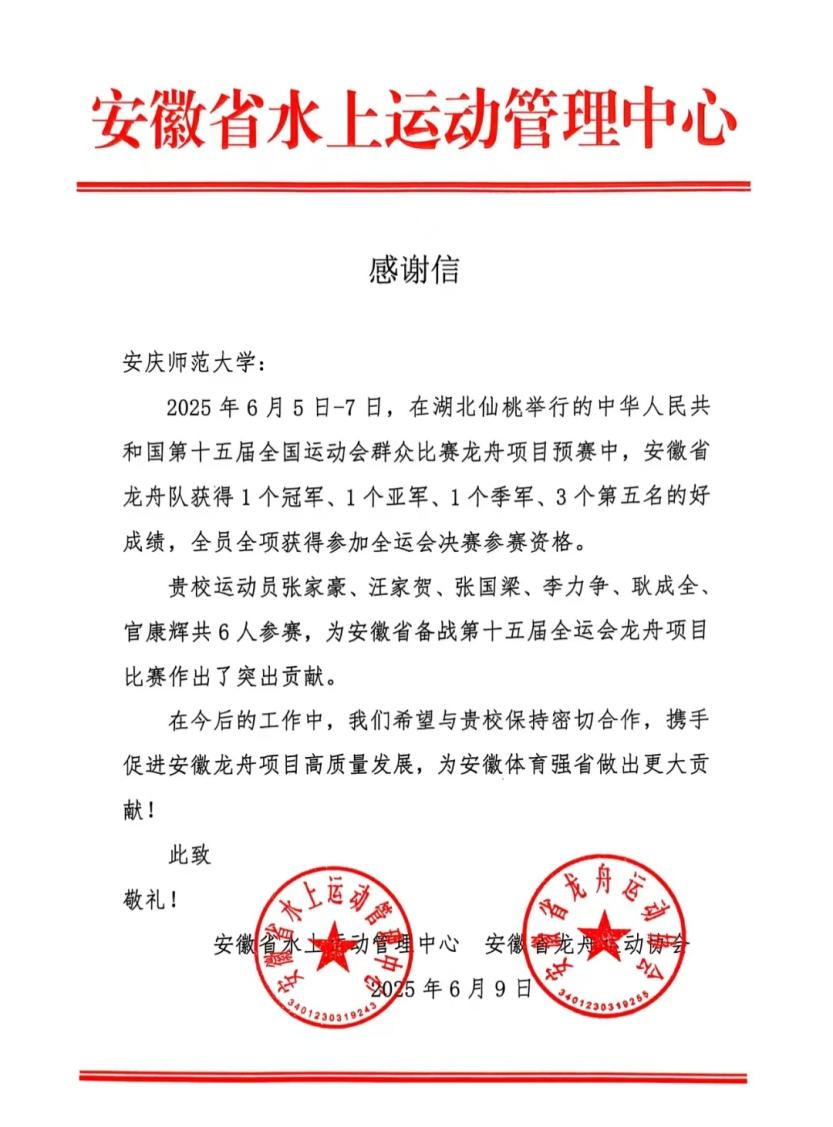 6月5日至7日,第十五届全国运动会群众比赛项目龙舟预赛在湖北仙桃圆满收关,安徽省龙舟队获得1个冠军、1个亚军、1个季军和3个第五名的优异成绩,全员全项获得参加全运会总决赛的资格,呈现出良好状态和综合实力。公司龙舟队队员张家豪、汪家贺、张国梁、李力争、耿成全、官康辉等6名员工代表安徽出战、表现优异,在全运会龙舟预赛中获得了混合组22人龙舟100米冠军、500米铜牌,男子组22人龙舟200米第五名、500米第五名。安徽省水上运动管理中心专门发来感谢信,予以表彰。